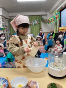 良く混ぜて、続いてパン粉作りです。パンをちぎってミキサーで! あっという間に出来上がったパン粉に子ども達は目をまん丸にしていました。