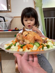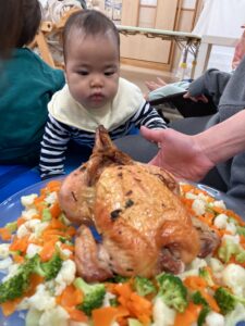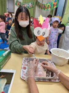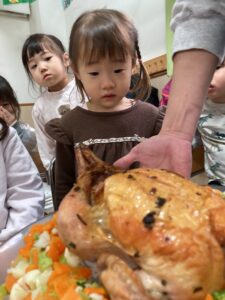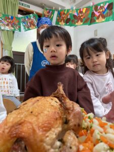 サンクスギビング・デーでは七面鳥をいただくのですが、園ではニワトリをいただきました。