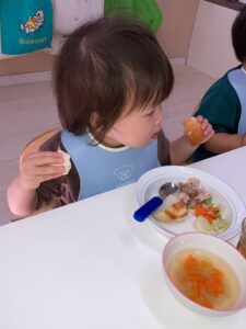 待ちに待ったランチです。みんなで下ごしらえしてカットしたチキンやお野菜にいただけることを感謝して美味しくいただきました。