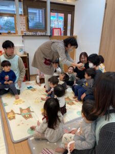 「おっ!!」「何か出てきたよ!」と指差しをする子どもたちやじーっとお話を真剣に聞く子どもたち。