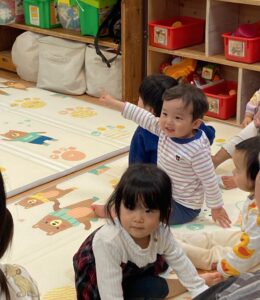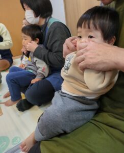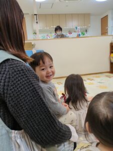 「おもちびよーん!」の手遊びをしたり、お正月飾りや伝承遊びを見たりしました。