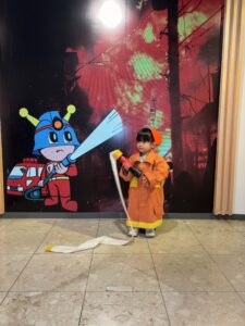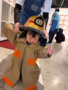 消防服を着る事ができるコーナーでは、かわいい消防士さんになって写真を撮りました!