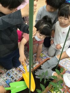 3歳以上のクラスでもプランターに野菜の苗を植えました。土をつくるところからとても興味深そうに見ていましたよ。