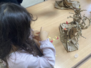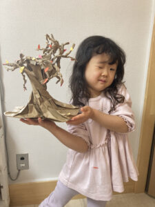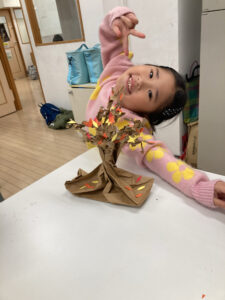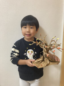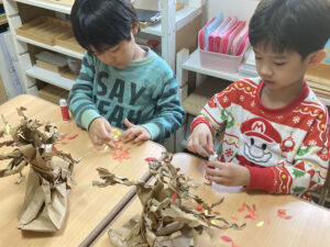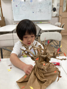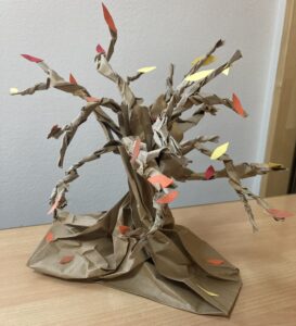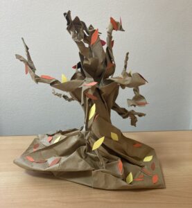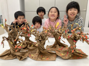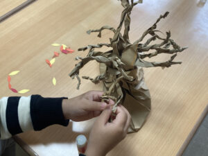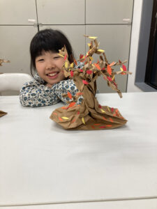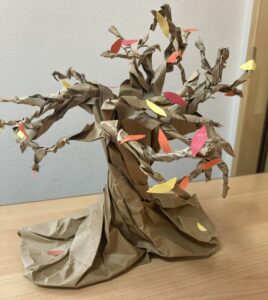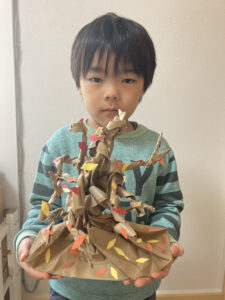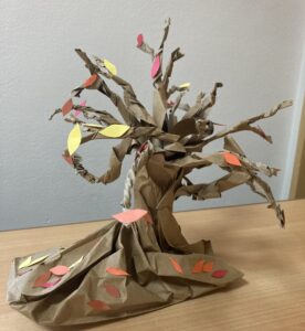 材料は、木には茶色の紙袋、葉には赤、オレンジ、黄色の画用紙だけでした。