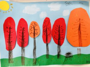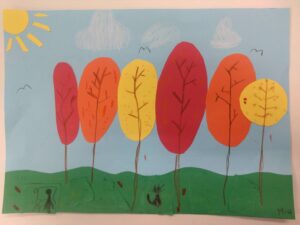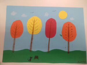 The children first cut out tree shapes from red, orange, and yellow paper, choosing any shape or number of trees they liked. They cut the ground from green paper and glued it to the bottom of a light blue sheet. Then they glued their trees above the ground, leaving space between them. Using dark brown pencils, they drew trunks from the ground up into the trees and added branching lines.The students were free to add any details they could think of, which included birds in the sky, and a park bench with a cat sitting next to it.”