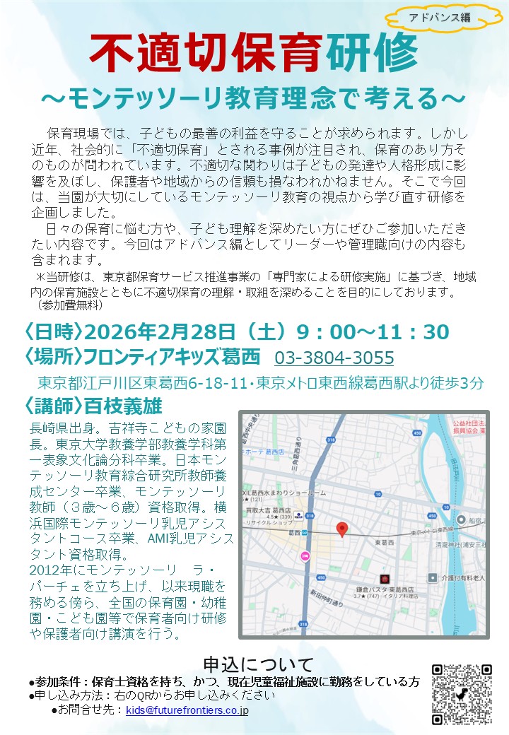 フロンティアキッズ葛西では、保育に携わる方向けに「不適切保育研修」と「メンタルヘルス研修」を下記の要領でおこないます。