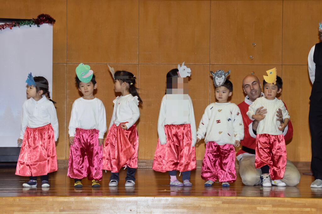 アドベンチャークラス(2歳児クラス・年少々クラス)も振り付けのついた歌を一生懸命に発表しました。大きな会場で多くのお客さんの前で演じることはとても大きな挑戦になりますが、みんなそれぞれ勇気を出して、ご家族を前にして自分の成果を表現して輝くことができました。
