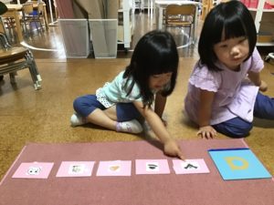 Matching, beginning sounds with picture cards and play the I spy, games with sounds and object’s. (Letters)