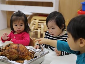 大きな七面鳥とチキンを調理で丸焼きにして、各クラスに持っていくと、子どもたちは目を丸くして興味津々な様子でした。大きな鳥を一羽まるごと見ることはなかなかないので、先生からサンクスギビングについてのお話しを聞いてからお昼に取り分けられたお肉に感謝していただきました。