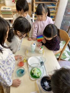 The children have fun adding food coloring to real snow, imitating shaved ice (kaki gōri).